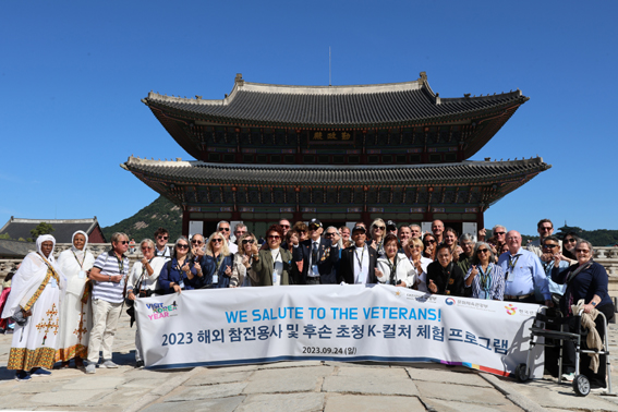 해외 6.25 전쟁 참전용사 및 후손 43명이 경복궁 근정전 앞에서 단체 기념사진을 촬영하고 있다.