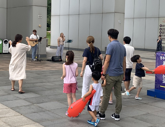 경주엑스포대공원을 찾은 관람객들이 팔레트의 버스킹을 즐기고 있다