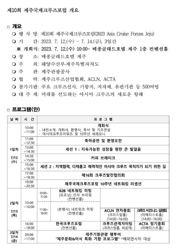 - 제10회 제주국제크루즈포럼 오는 7월 12일부터 14일까지 개최