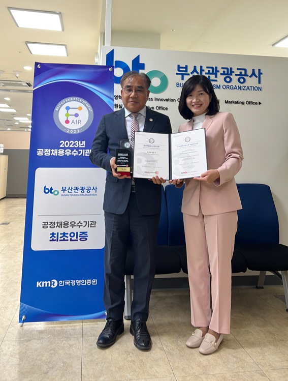 이정실 부산관광공사 사장(왼쪽)은 한국경영인증원(KMR)으로부터 2023년 공정 채용 우수기관 인증을 부산시 공공기...[제1215호]2023-06-21 10:49