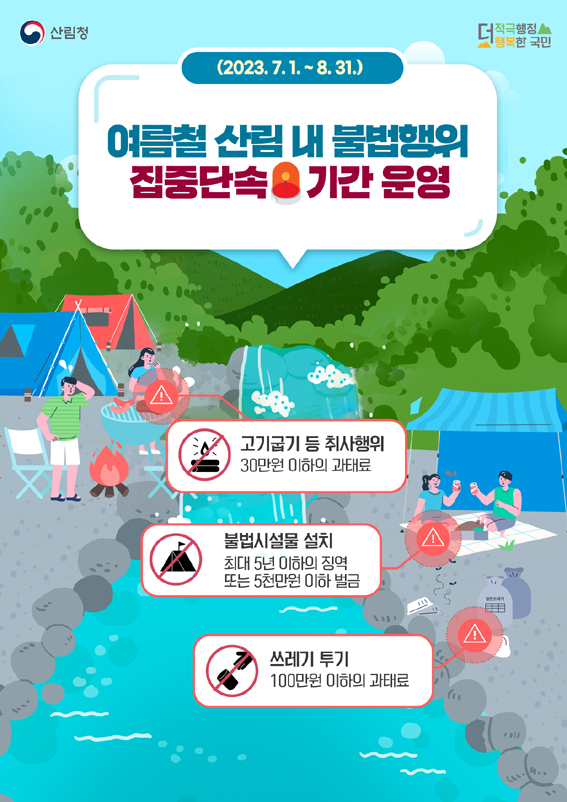 - 7월 1일부터 8월 말까지 산림 내 불법행위 집중 단속