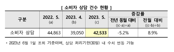 한국소비자원, 5월 소비자 상담건수 전월 대비는 8.9% ...[제1214호]2023-06-16 11:08