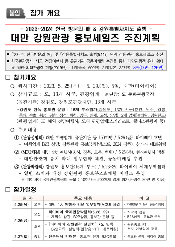 - 대만관광객 유치 우한 대규모 강원관광 홍보 세일즈 추진