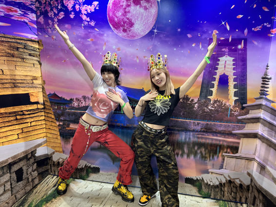 일본관람객들이 신라왕관을 쓰고 경주엑스포대공원 홍보 포토존을 배경으로 기념사진을 찍고 있다