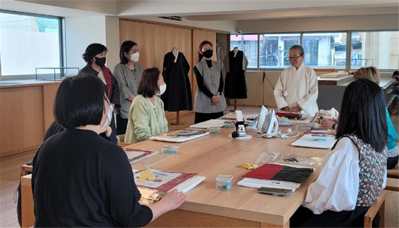누비장 김해자 선생이 자신의 공방에서 누비 교육을 하는 모습