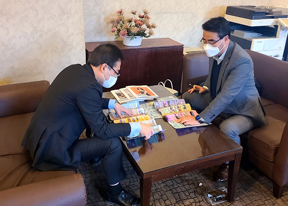 대구 그랜드호텔 관계자(왼쪽)에게 경주엑스포대공원 시설관 콘텐츠에 대해 설명하고 있다.
