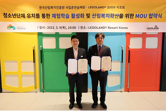 레고랜드가 국립춘천숲체원과 업무협약을 체결했다. 왼쪽부터 이정일 레고랜드 코리아 리조트 상무와 최정호 국립...[제1203호]2023-03-10 10:34