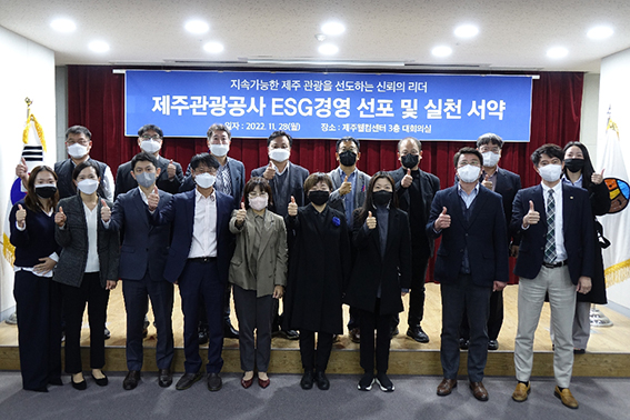 지속가능한 제주 관광을 선도하는 신뢰의 리더 제주관광공사 ESG 경영 선포 및 실천 서약식에서 임직원들이 단체 ...[제1194호]2022-11-29 11:03