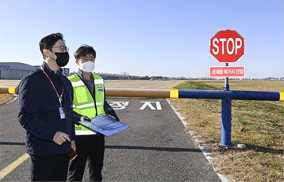 윤형중 한국공항공사 사장(왼쪽)이 지난 4일, 김포국제공항 경항공기지역 비상 접근도로에서 비행기 이착륙시설에 대...[제1191호]2022-11-07 10:16