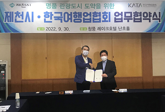 오창희 한국여행업협회 회장(왼쪽)과 김창규 제천시장(오른쪽)이 지난 9월 30일 명품 관광도시 제천 도약을 위한 ...[제1190호]2022-10-05 11:04