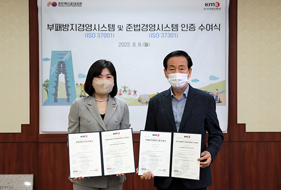 류희림 (재)문화엑스포 대표(오른쪽)가 황은주 한국경영인증원 대표(왼쪽)로부터 부패방지경영시스템 및 준법경영...[제1185호]2022-08-09 10:46