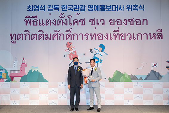 최영석 태국 국가 대표 태권도 감독(오른쪽)이 서영충 한국관광공사 국제관광본부장(왼쪽)으로부터 한국관광 명예홍...[제1183호]2022-07-08 10:37