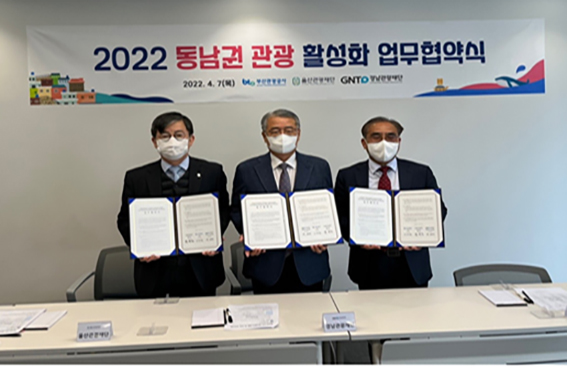 왼쪽부터 함경준 울산관광재단 대표이사, 박성재 경남관광재단 대표이사 직무대행, 이정실 부산관광공사 사장이 202...[제1174호]2022-04-08 10:26