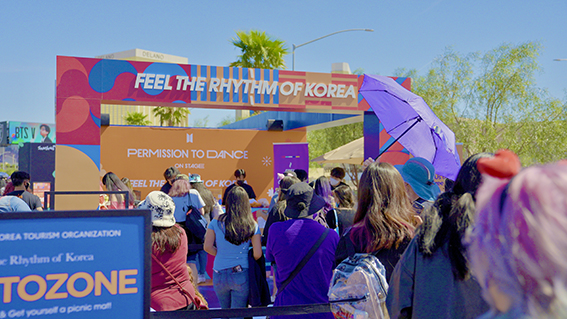 BTS 라스베이거스 콘서트가 열리는 엘리전트 스타디움에 마련된 한국관광 홍보부스에서 체험을 기다리고 있는 참...[제1174호]2022-04-11 10:57