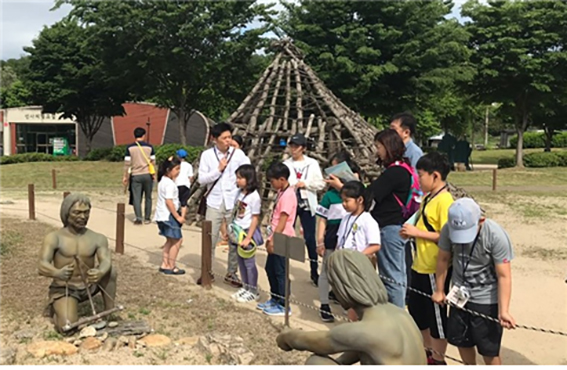 서울 암사동 유적에서 가족답사를 참가하고 있는 시민들.