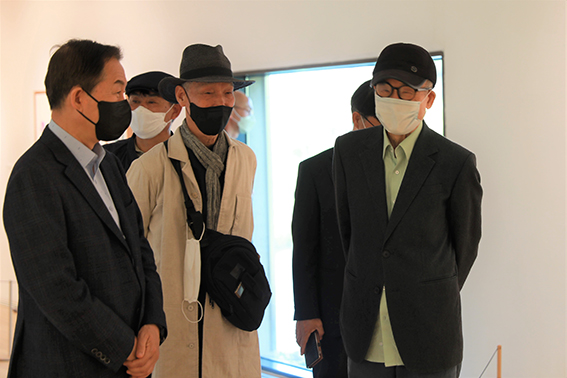 고은 시인(오른쪽)이 경주솔거미술관을 방문해 박대성 화백(중간), 류희림 경주엑스포 대표(왼쪽)와 함께 경...[제1174호]2022-04-13 10:59