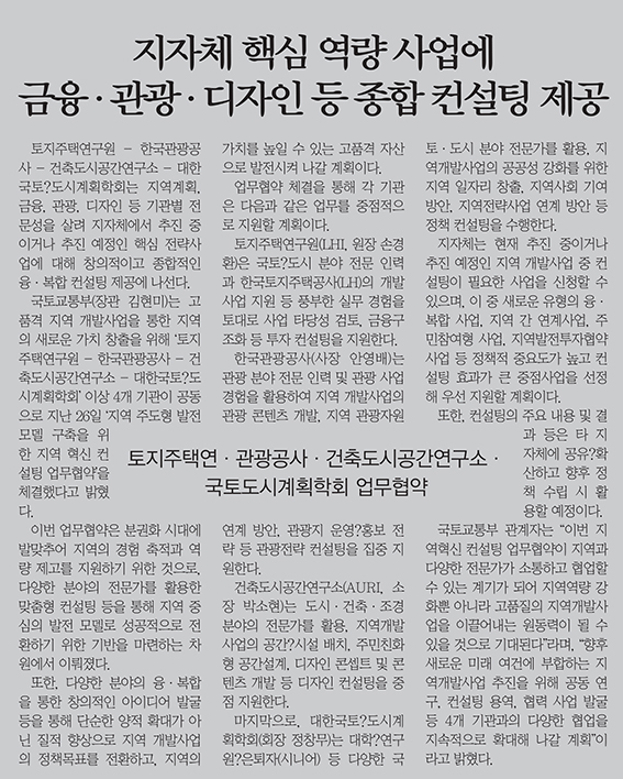 토지주택연·관광공사·건축도시공간연구소·국토도시계획학회 업무협약