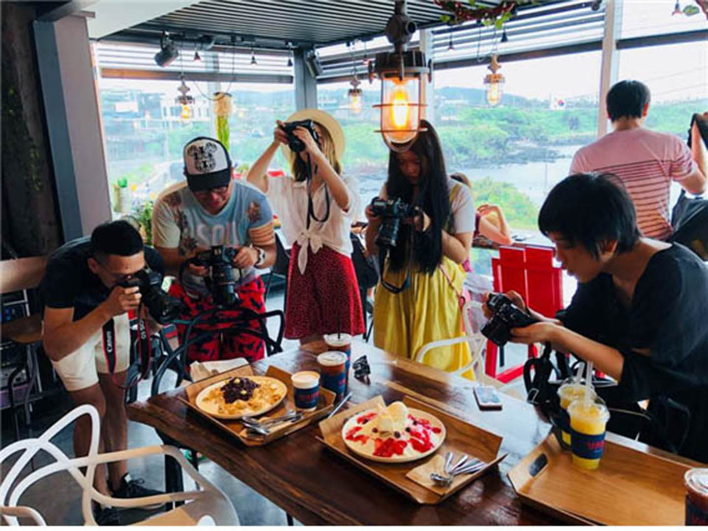 한담해변 이색카페를 취재하는 인플루언서 팸투어단 일행들.
