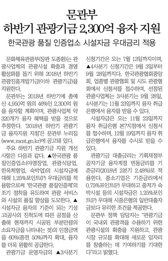- 문관부, 하반기 관광기금 2,300억 융자 지원
