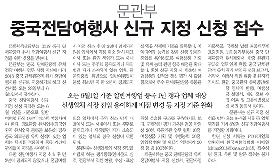 - 문관부, 중국전담여행사 신규 지정 신청 접수