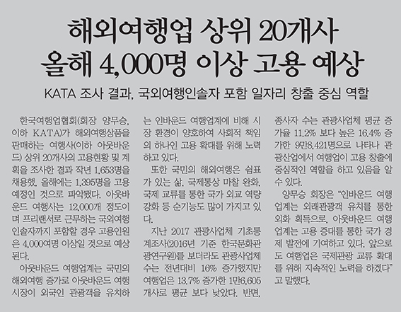 KATA 조사 결과, 국외여행인솔자 포함 일자리 창출 중심 역할