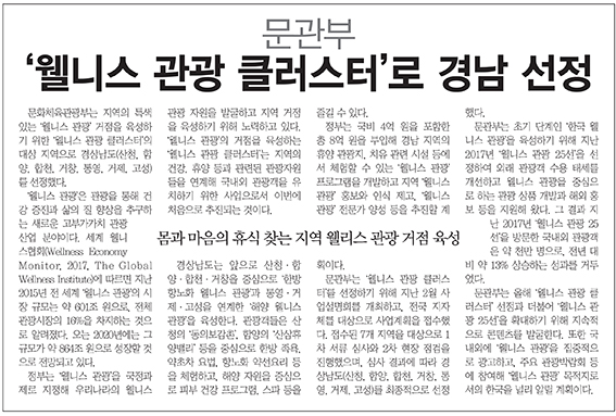 - 문관부, ‘웰니스 관광 클러스터’로 경남 선정