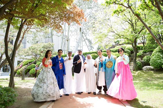 중동 지역 유력 언론인들이 팸투어에 참가해 한복을 입고 기념사진을 촬영하고 있다.