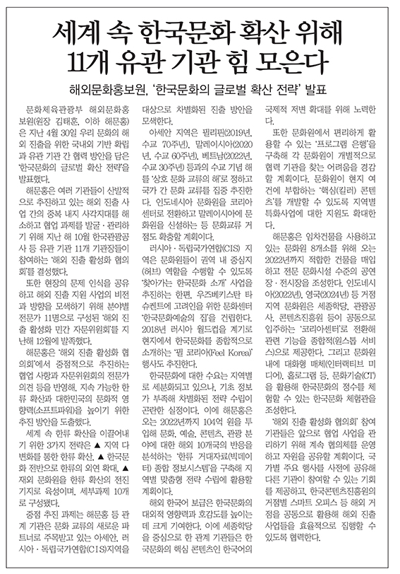 - 세계 속 한국문화 확산 위해 11개 유관 기관 힘 모은다