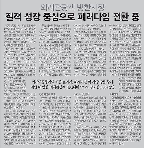 외래관광객 방한시장 질적 성장 중심으로 패러다임 전환 중