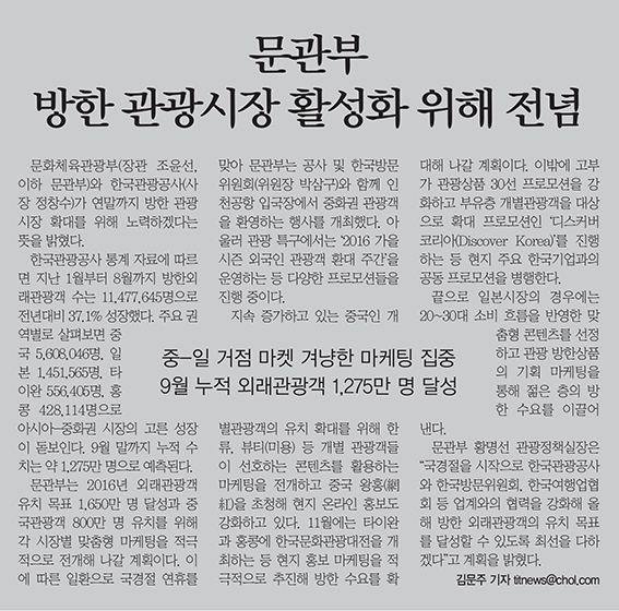 - 문관부 방한 관광시장 활성화 위해 전념