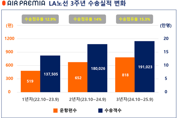 - 에어프레미아, LA노선 취항 3년…수송 점유율 올라가