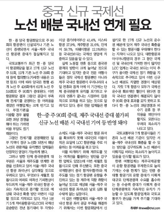 - 한-중 주 90회 증대, 제주 국내선 증대 불가피