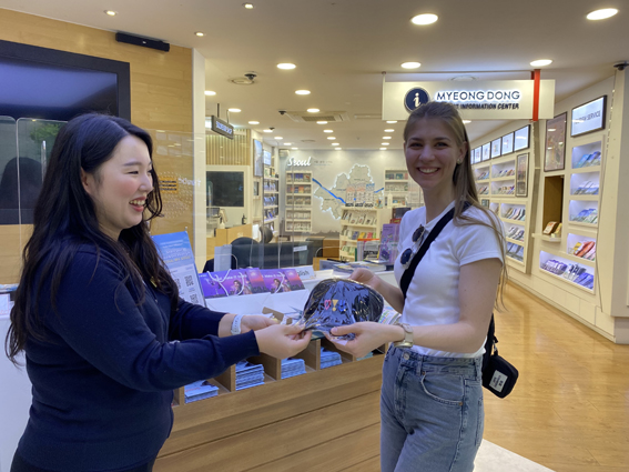 명동관광정보센터에 방문한 독일인 관광객이 비짓서울 이벤트 참여 후 서울굿즈 기념품을 받고 있다.