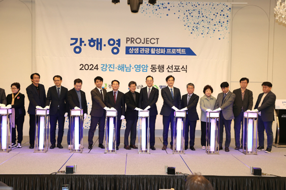 지난 3월 12일 서울에서 열린 강진군, 해남군, 영암군 3개 군의 '강해영 프로젝트' 동행 선포식에서 3개 군 군...[제1237호]2024-03-13 10:50