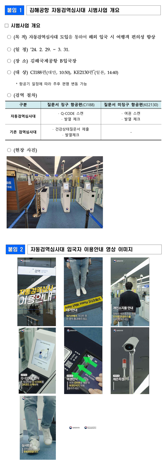 - 김해공항(B입국장)에서 자동검역심사대 시범 운영