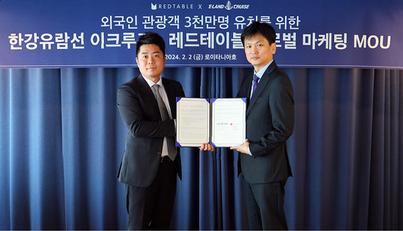 박동진 이크루즈 대표(왼쪽)와 도해용 레드테이블 대표(오른쪽)가 업무협약을 체결하고 기념사진을 촬영하고 있다....[제1235호]2024-02-16 10:41