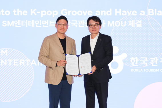 유진호 한국관광공사 관광콘텐츠전략본부장(오른쪽)이 한국관광공사-SM엔터테인먼트 업무 협약식을 체결한 후 기...[제1235호]2024-02-08 10:32
