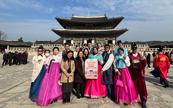 경복궁 한복 체험을 즐기는 블레저 관광 프로그램 참가자들