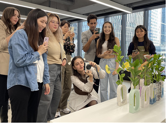 제스모나이트 화병 만들기 체험 후 참가자들이 사진촬영을 하고 있다.