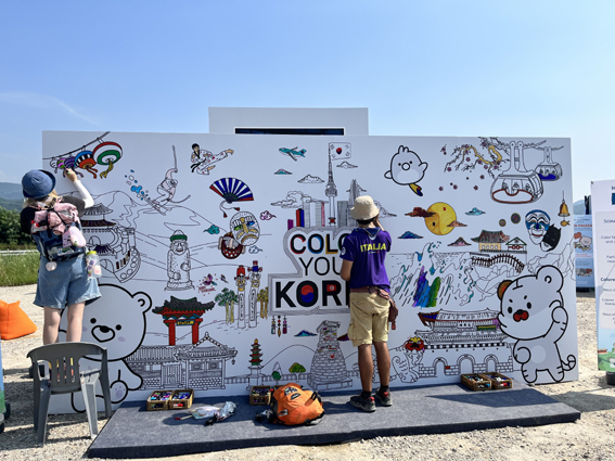 한국관광명소 컬러링월을 색칠하고 있는 잼버리 스카우트 단원들.