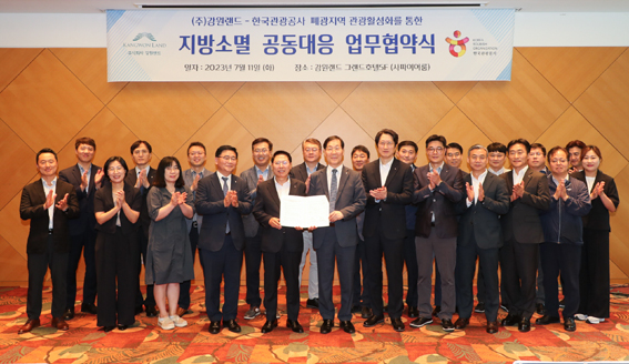 지난 7월 11일, 지방 소멸 공동 대응을 위한 업무협약식에 참석한 김장실 한국관광공사 사장(오른쪽)과 이삼걸 ㈜...[제1217호]2023-07-12 10:25