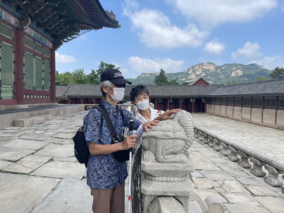 서울관광재단 현장영상해설사의 해설을 들으며 해치를 만져보는 시각장애인 관람객