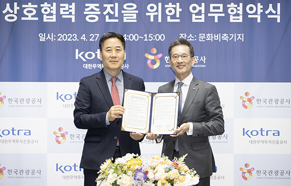 서영충 한국관광공사 국제관광본부장(왼쪽)과 김태형 KOTRA 인베스트코리아 대표(오른쪽)가 업무협약을 체결하고 ...[제1210호]2023-04-28 10:53