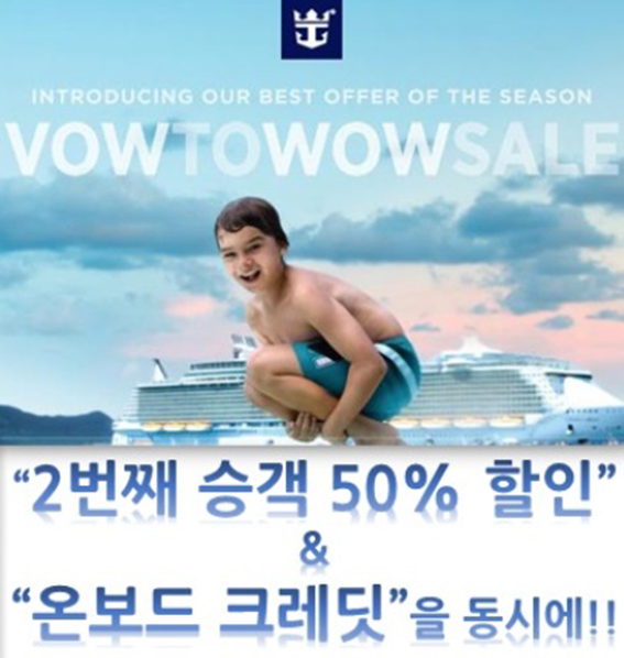 로얄캐리비안 크루즈(www.rccl.kr)가 송년특별할인 프로모션 'Vow to Wow Sale'을 실시한다. 12월 31일까지 시행되는 프로모션은 일정 예약 시 2번째 승객의 선실요금에서 50% 할인과 함께 예약 선실 등급에 따라 온보드 크레딧이 지급된다. 온보드 크레딧이란 선내에서 사용 가능한 통화수단으로 레스토랑, 바, 카지노, 스파 등 다양한 용도로 사용이 가능하다. 스위트 선실을 기준으로 온보드 크레딧 300달러가 객실 단위로 제공되며 발코니 선실 예약 시 200달러, 오션뷰&내측 예약 시 100달러가 제공된다. 2015년 크루즈 여행을 계획하고 있다면 다양한 할인 혜택을 함께 챙길 수 있는 좋은 기회가 될 것이다. 문의 02)737-0003.