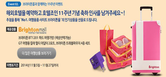 응모자 중 추첨을 통해 뽑힌 24명에게 이미 많은 스마트 컨슈머들 사이에 합리적인 가격의 여행용품을 구매할 수 있는 브랜드로 알려진 브라이튼몰의 100만 원 상당의 인기 여행용품인 캐리어, GT여행용 멀티 어댑터, 트래블 파우치 등을 증정한다. 이 밖에도 11시 행운잔치, 국내 호텔을 특전과 특가로 제공하는 등 11주년을 기념하는 프로모션들이 준비됐다. 문의 02)2017-4674.