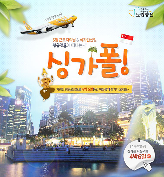 스쿠트항공으로 떠나는 4박 6일 일정의 싱가포르 자유여행은 타이완을 경유하는 특가상품으로 항공권 단독 구매 시 35만 9천 원부터, 호텔과 항공을 포함하는 에어텔 상품은 56만 9천 원부터 만나볼 수 있다. 에어텔 상품 선택 시 전 일정 숙소는 2성급부터 5성급까지 준비돼 있어 고객 성향에 맞는 자유로운 선택이 가능하며 팀당 가이드북과 다용도 지퍼백 및 네임택이 제공된다.