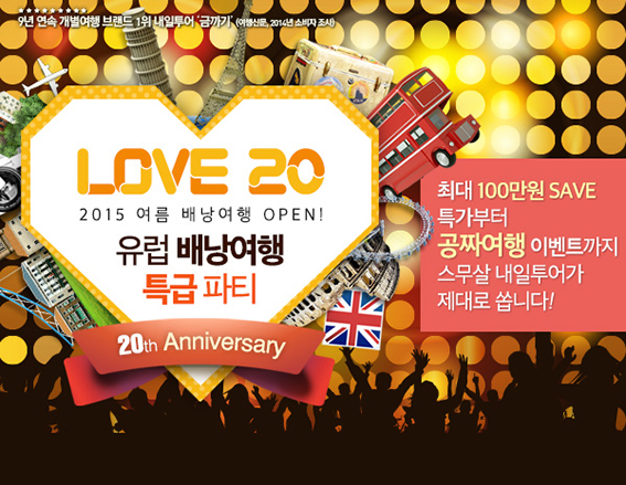 내일투어가 창립 20주년을 기념해 통큰 배낭여행 이벤트를 오픈했다. ‘Love 20 : 유럽배낭여행 특급 파티’를 슬로건으로 7가지 이벤트를 선보인 것. 유럽배낭여행 최대 100만 원 혜택부터 유럽 공짜여행까지 풍성한 경품을 증정한다.