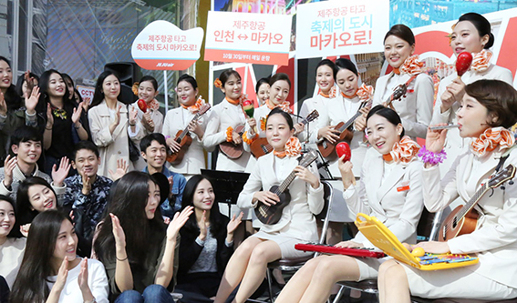 마카오 신규 취항을 홍보하는 거리공연을 펼쳤다. <사진출처=제주항공>