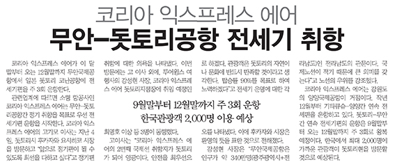 9월말부터 12월말까지 주 3회 운항 한국관광객 2,000명 이용 예상