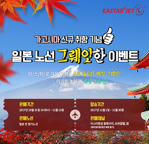 이번 기념 이벤트는 오는 13일까지 진행되며 11월 출발하는 이스타항공의 7개 일본 전 노선이 대상이다.